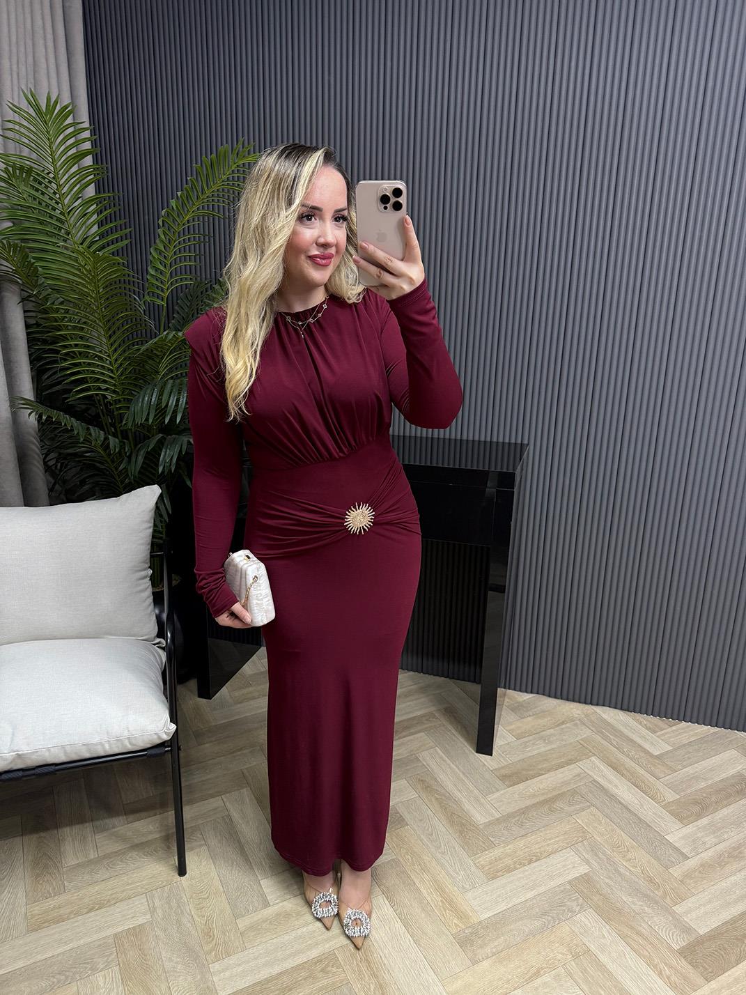 Evan Gold Detaylı Tokalı Vatkalı Elbise Bordo (EL2326)