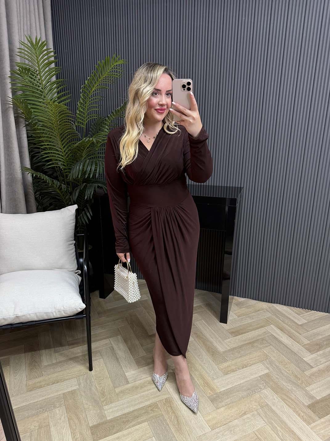 Helena Kruvaze Görünümlü Sandy Elbise Acı Kahve (EL2321)