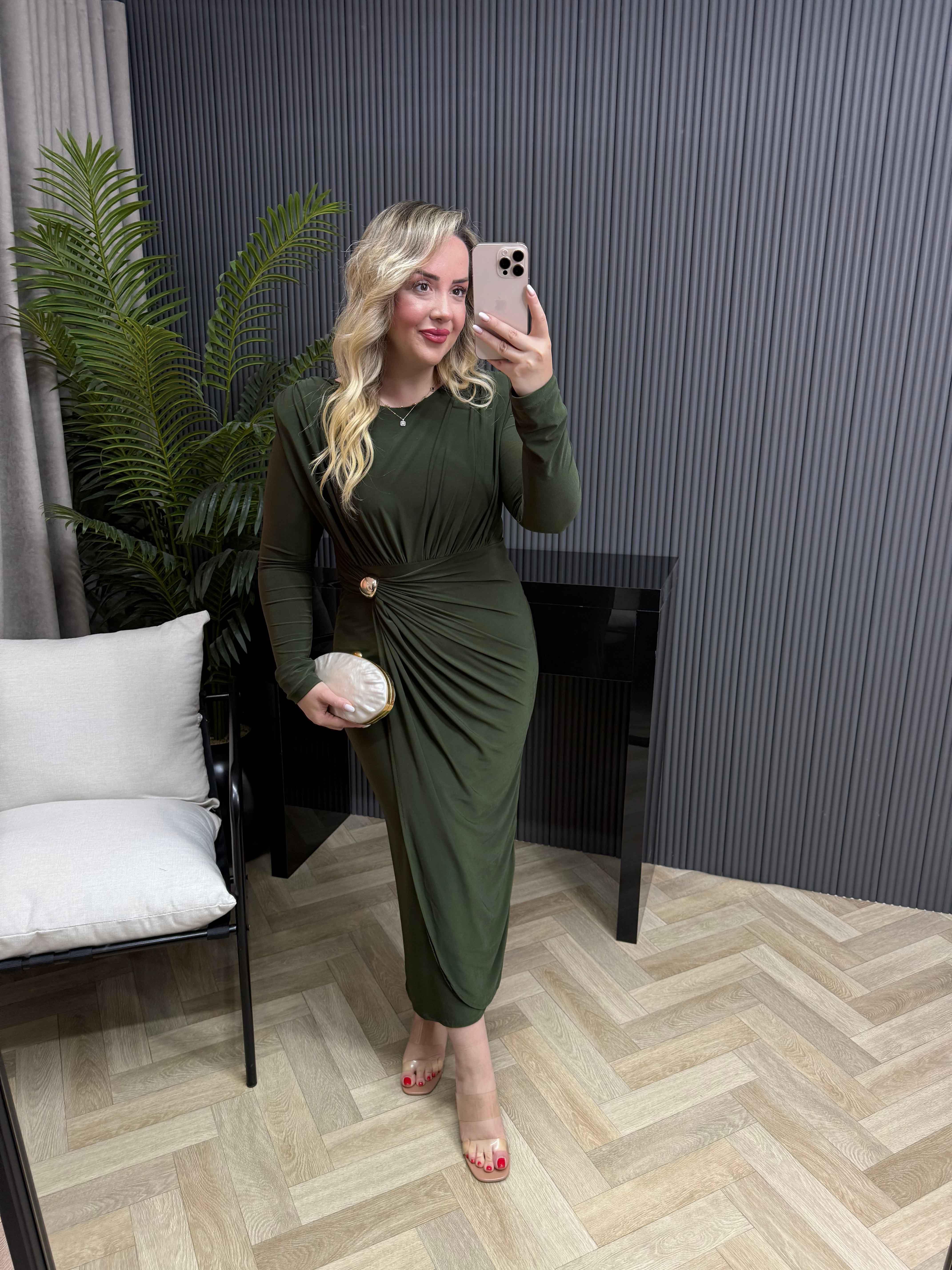 Jade Gold Düğme Detaylı Kruvaze Görünümlü Vatkalı Elbise Haki