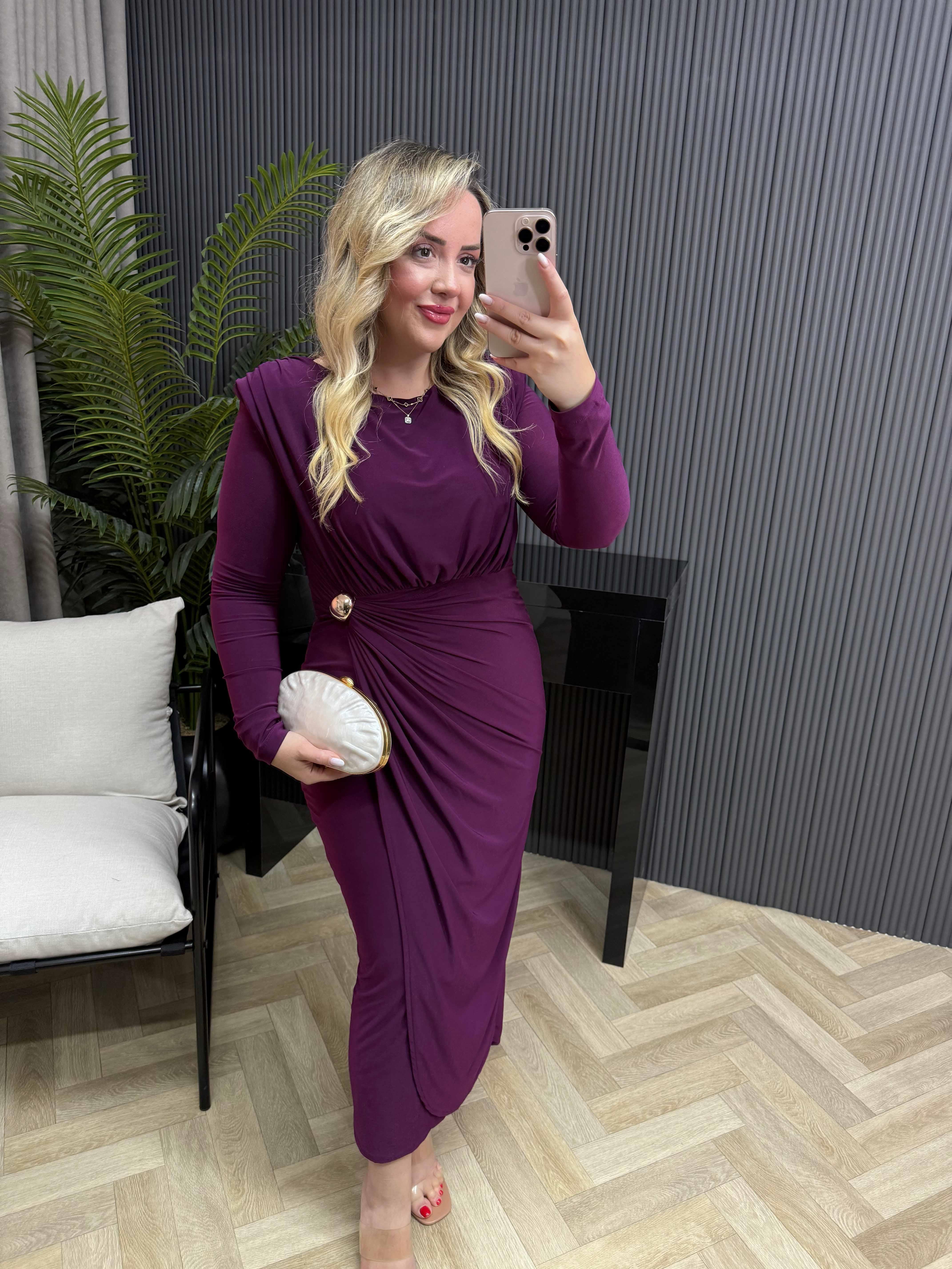 Jade Gold Düğme Detaylı Kruvaze Görünümlü Vatkalı Elbise Mor (EL2318)