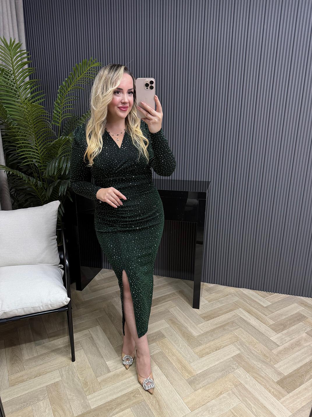 Milly Vatkalı Drapeli Özel Kumaş Taşlı Elbise Zümrüt (EL2324)