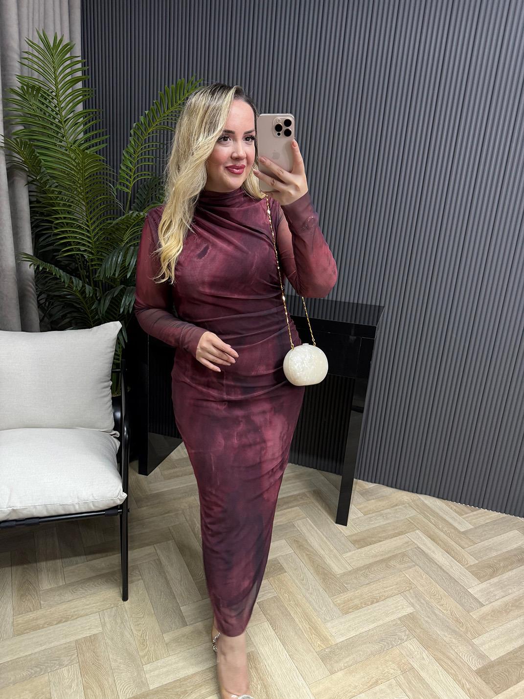 Wilma Drapeli Desenli Tül Elbise Bordo (EL2328)