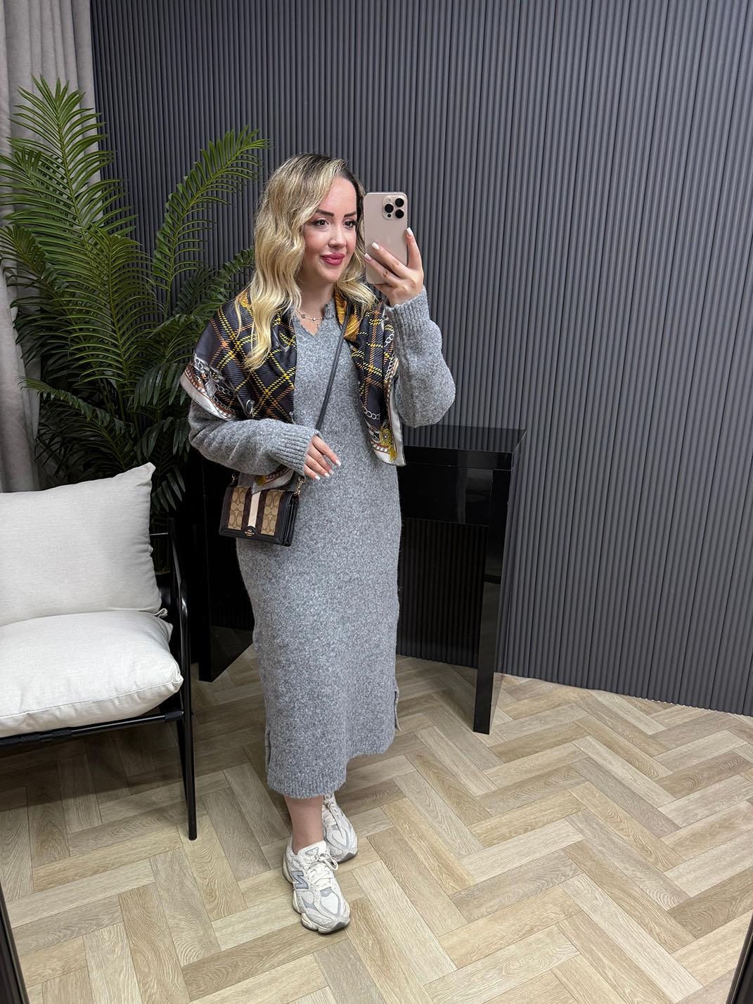 Yumoş Dokuda Triko Elbiseler Gri (EL2335)