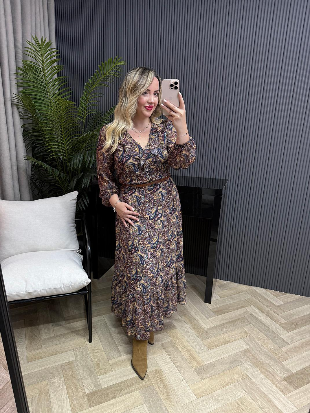 Ahel Etnik Desenli Kemerli Tasarım Şifon Elbise
